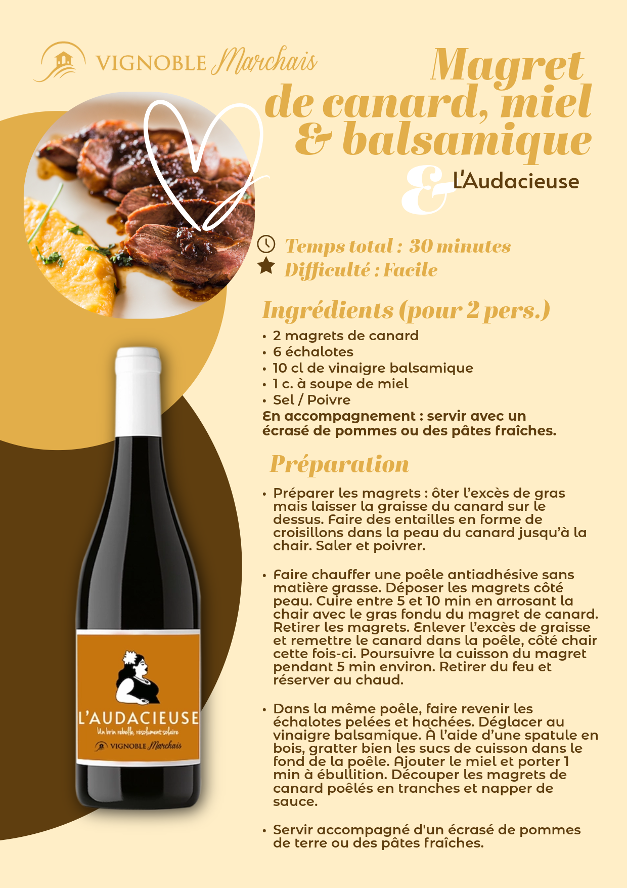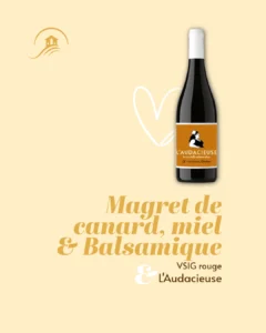 Les notes chaleureuses et solaires de L’Audacieuse, inspirées des rouges du Sud, s’accordent parfaitement avec la chair fondante du magret et la douceur du miel, relevée par la pointe d’acidité du vinaigre balsamique.