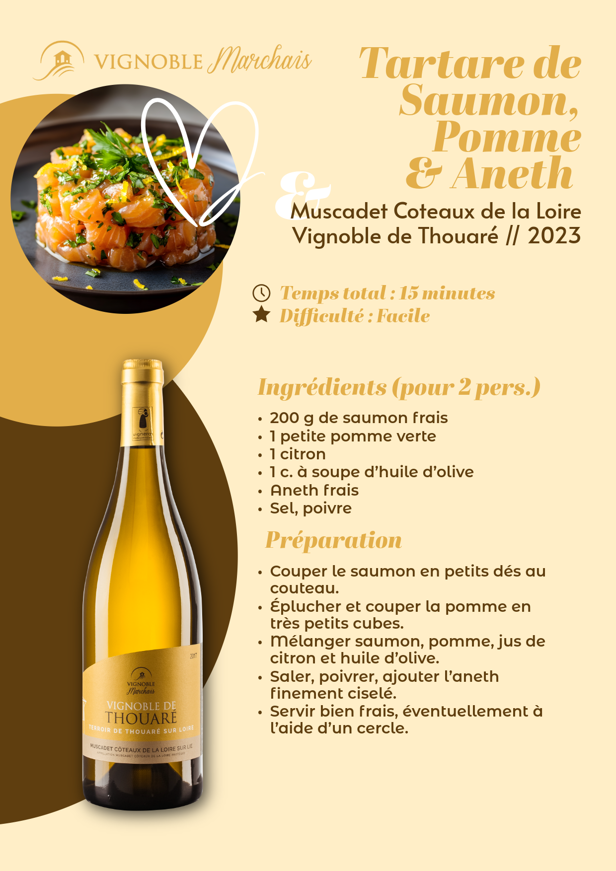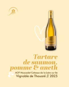 Le caractère vif et élégant du Muscadet met en valeur la délicatesse du saumon cru et ses assaisonnements.