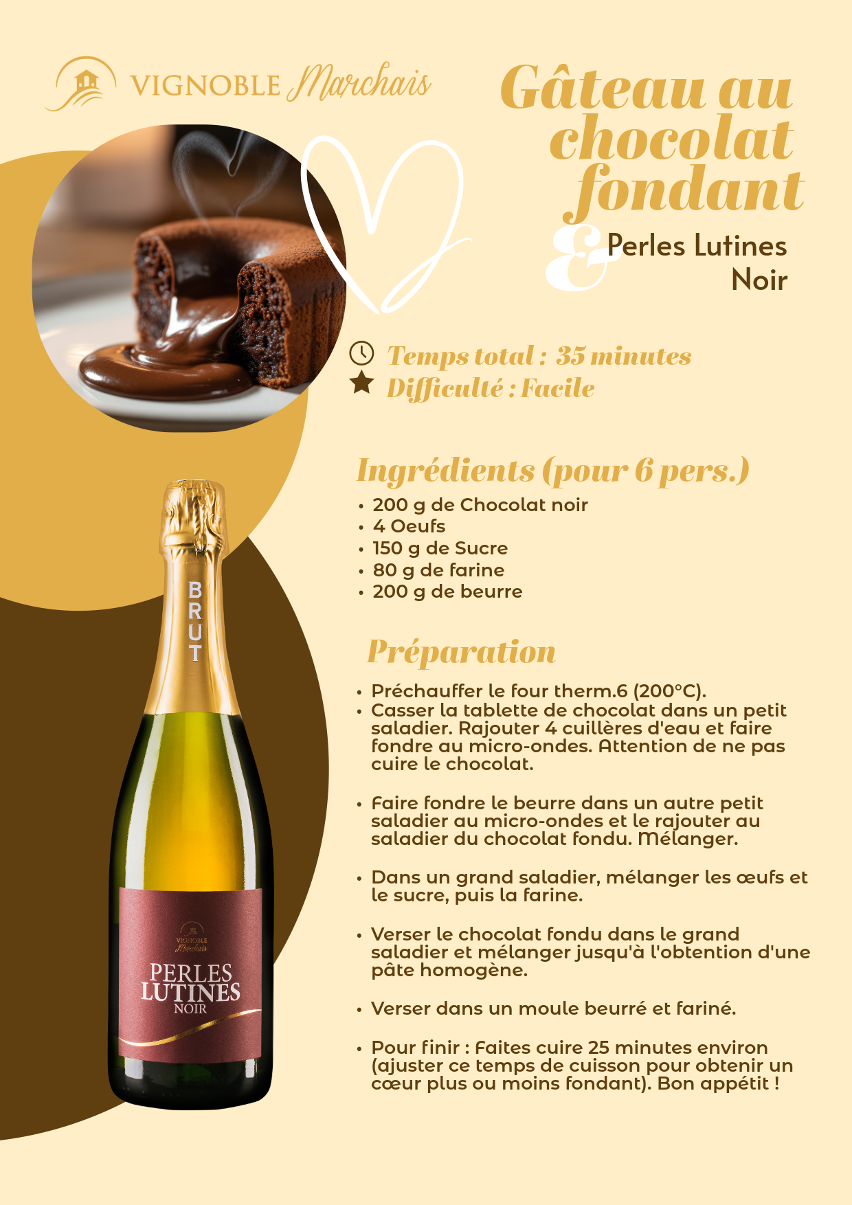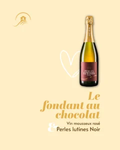 Pour terminer votre dîner sur une note douce et festive, nous vous proposons un accord tout en finesse entre Perles Lutines Noires, notre vin mousseux rosé, et un gâteau fondant au chocolat.
